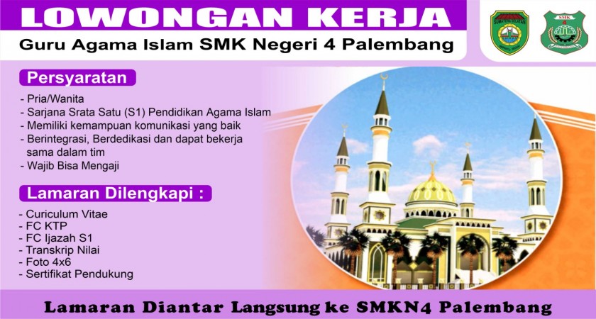 Ayo bergabung di SMK Negeri 4 Palembang dalam mencerdaskan anak bangsa! Dibuka lowongan bagi tenaga pengajar Guru Desain Pemodelan dan Informasi Bangunan, Guru Teknik Mesin, Guru Pendidikan Agama Islam dan Guru Bimbingan dan Konseling